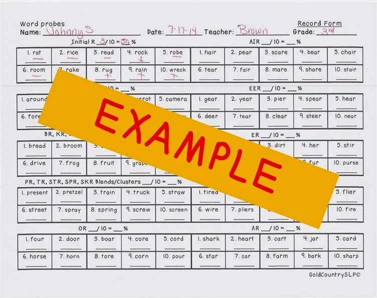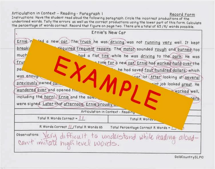 Next, you are ready to check your student’s intelligibility further by using the paragraph material provided. There are two paragraphs and each is loaded with R words. The student’s copy is to be read aloud by the student and contains no marks. The examiner’s copy has every R word underlined so you will be able to circle the words that are misarticulated quickly and easily. Tally up the errors and use the quick and easy formula to determine the percentage of R words correctly produced. Enter this on the protocol in the appropriate area.