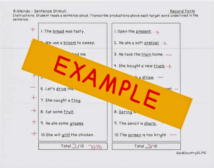 For continued testing, use the sentence-level stimuli. This is intended for students who can read, however, you may also read the sentence aloud and ask your student to repeat it back. Here is an example of the sentence-level stimuli. This is the examiner’s copy with the R-words underlined. The student’s copy does not have anything underlined.