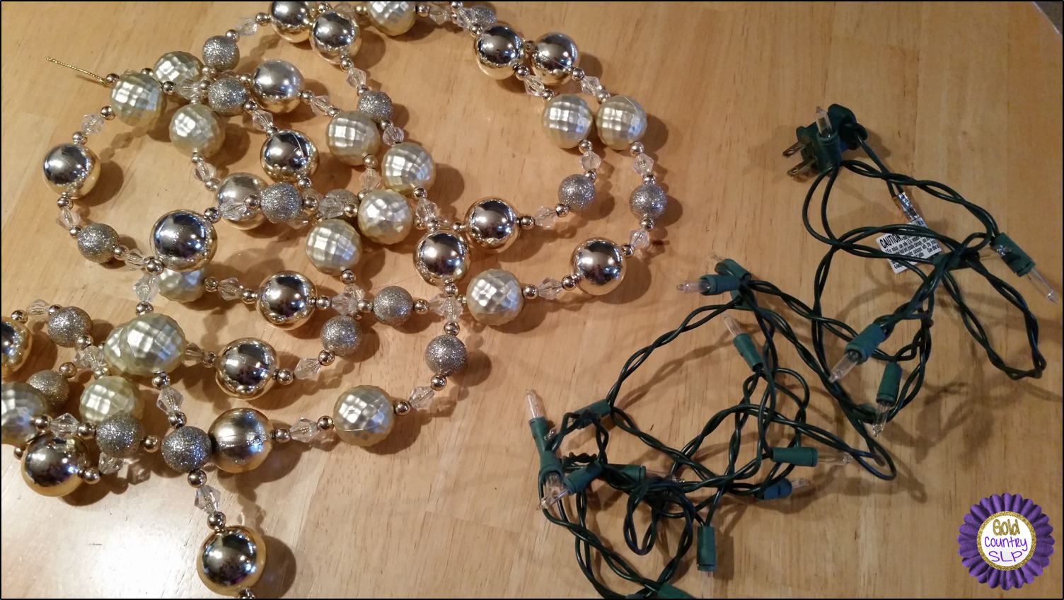Let’s jazz it up with a mini light string and a string of ornaments found at WalMart.