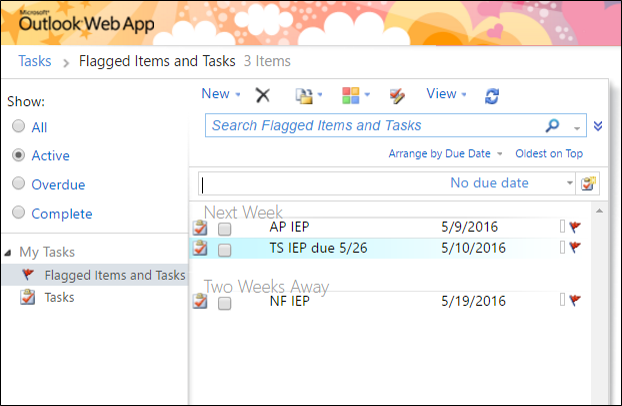 Once you click on it, a list will open up. Below is a photo of the left half of my Outlook task screen. This is what it looks like when you add items to it. And yes, it has a box you can check off once the task is completed.