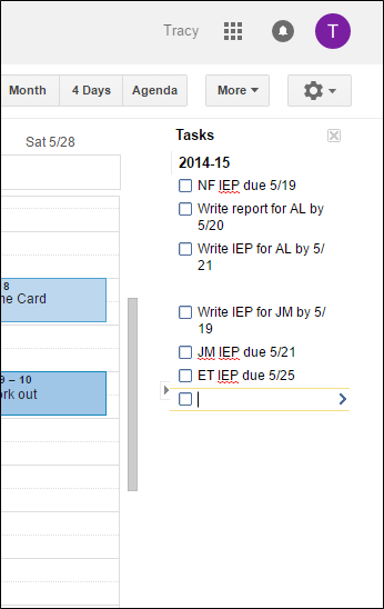 1) Use Google Calendar: On the side bar (left side) of Google Calendar, you will find a task list. Click on it. A potential task list will pop up on the right side. You can type in whatever your critical “to do” list for the rest of the year. I have a partial list pictured below. You will see that Google provides check boxes. When the task is complete, you check the box and it goes away. I LOVE checking off items as they are completed. Don’t you? So satisfying.