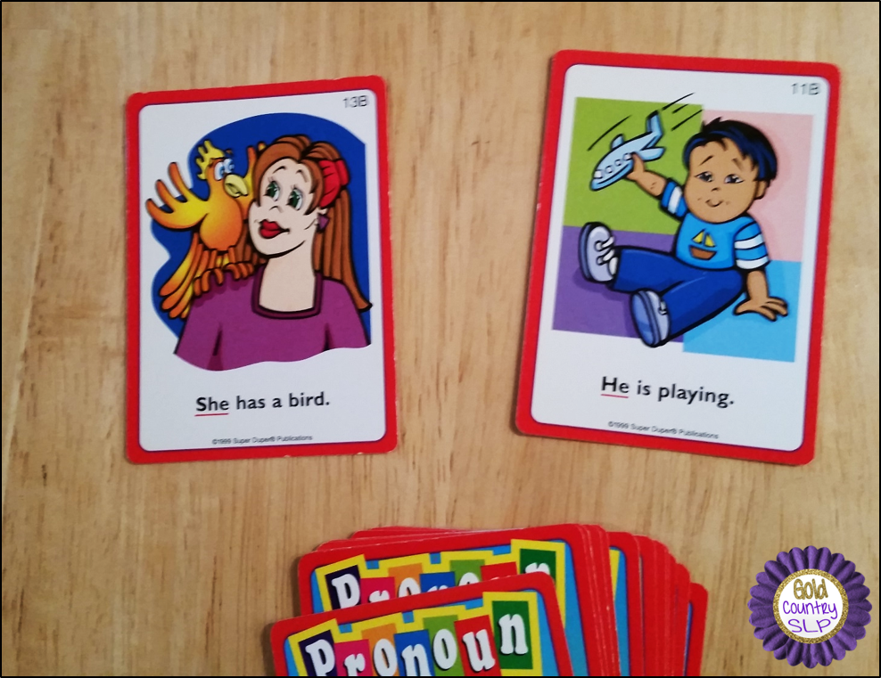For language concepts, you can target grammar, categories and more. Choose your deck. See below for the way I use pronouns as targets. Again, you need two concepts with one as your target. Let’s say you want to target identification and use of “she.” Use a pronoun deck that contains “she” and “he” targets. Don’t try to mix in other types of pronouns, unless your student is older and has attained proficiency with a variety of targets. Play as described above.
