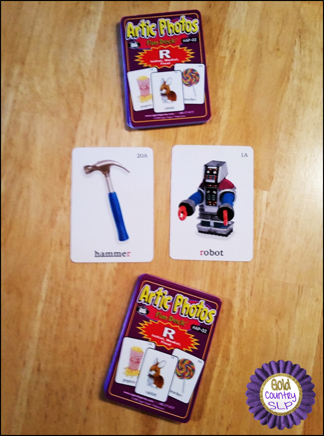 Now, exactly how does this work for artic and language? Let’s talk about artic first. Choose a sound deck for your student. For some reason, R comes to mind! I like to choose two positions such as initial and final. Remove the medial R cards. Next, you have to choose which position will be the target. Final R, perhaps? Prepare the game as described above. When the cards are flipped face up, the player who has the final R wins the round. In the photo below, the player who flipped up the hammer wins this round.